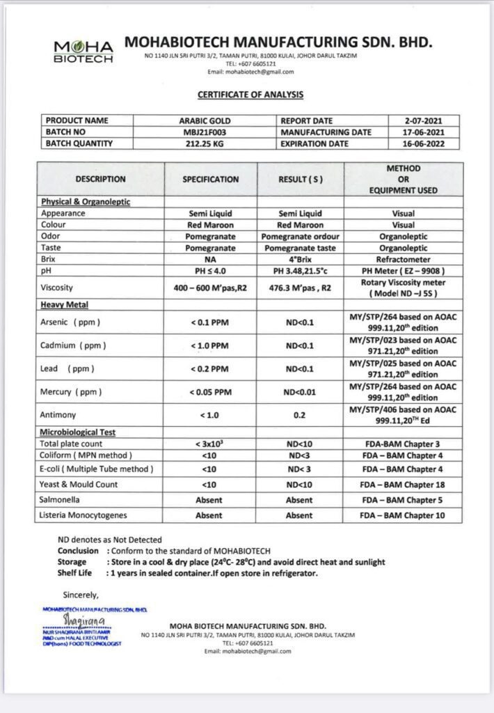 Bukti Jus Arabic Gold Melepasi Ujian Lab,Tiada Bahan-Bahan Terlarang