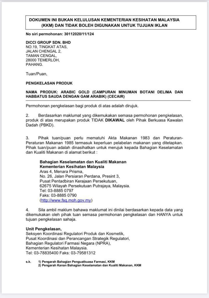Jus Arabic Gold Di Kelasifikasikan Sebagai Minuman Tambahan Buka Ubat.